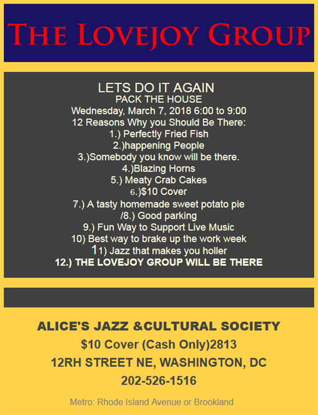 VENUES FOR BOOKINGS CONTACT: Mail: The Lovejoygroup 301-578-8679 The Lovejoygroup is a versatile ensemble serving up energetic jazz, funky blues and smooth Latin rhythms.